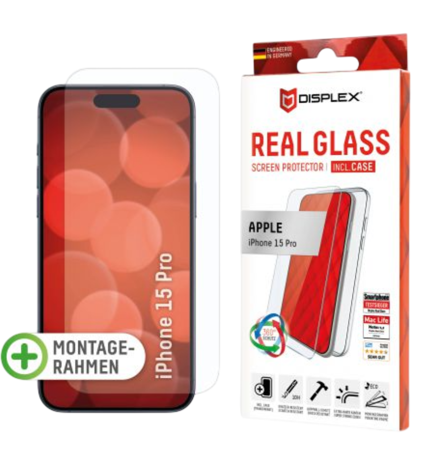Komplet DISPLEX Real Glass 2D + prozirna maskica posebno je dizajniran za Apple iPhone 15 Pro. Pruža pouzdanu zaštitu zaslona i rubova uređaja, uz zadržavanje elegantnog izgleda i pune funkcionalnosti.